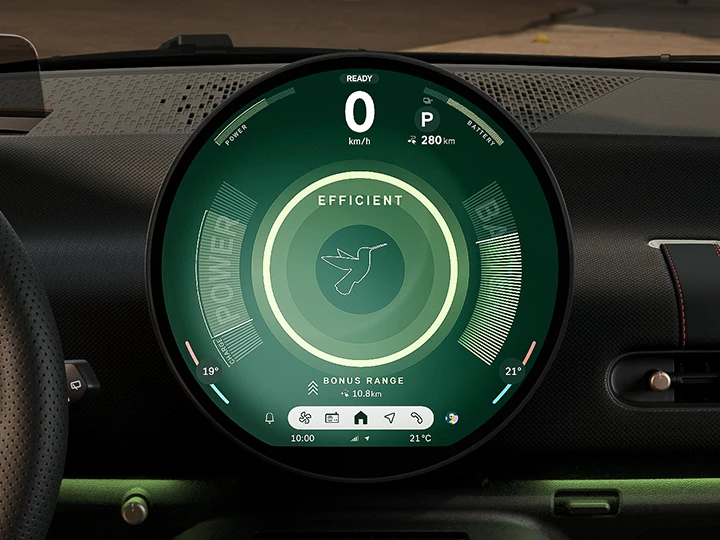 Możesz również aktywować tryb Efficient Mode, który ogranicza zużycie energii. Między innymi niemal niezauważalnie zmniejsza zużycie energii przez klimatyzację, ogrzewanie foteli i inne funkcje komfortowe. Nie martw się jednak nadmiernie o zasięg – trasa zoptymalizowana pod kątem ładowania w systemie nawigacyjnym MINI wskaże Ci, gdzie i kiedy należy uzupełnić energię.