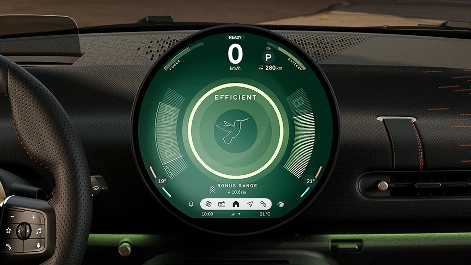 Twoje MINI zostało wyposażone w funkcje, które pozwalają dotrzeć jeszcze dalej. Przełącz się w tryb Efficient Mode, aby cieszyć się płynniejszą jazdą i maksymalnym odzyskiem energii. A kiedy liczy się każdy kilometr, do gry wchodzi tryb MAX RANGE – prędkość maksymalna zostaje ograniczona do 90 km/h, a funkcje komfortowe, takie jak klimatyzacja czy podgrzewanie foteli, są automatycznie ograniczane. Dzięki temu cała dostępna energia zasila jazdę naprzód.